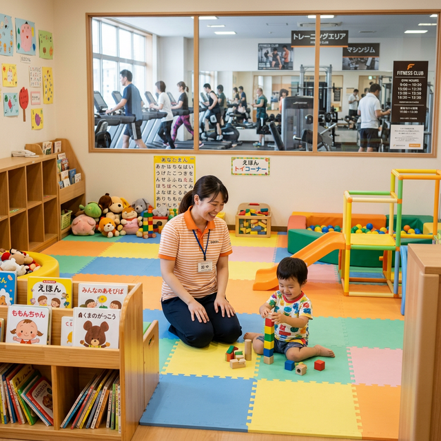 - トレーニング中も安心: トレーニングエリアから見える位置にキッズスペースを設置