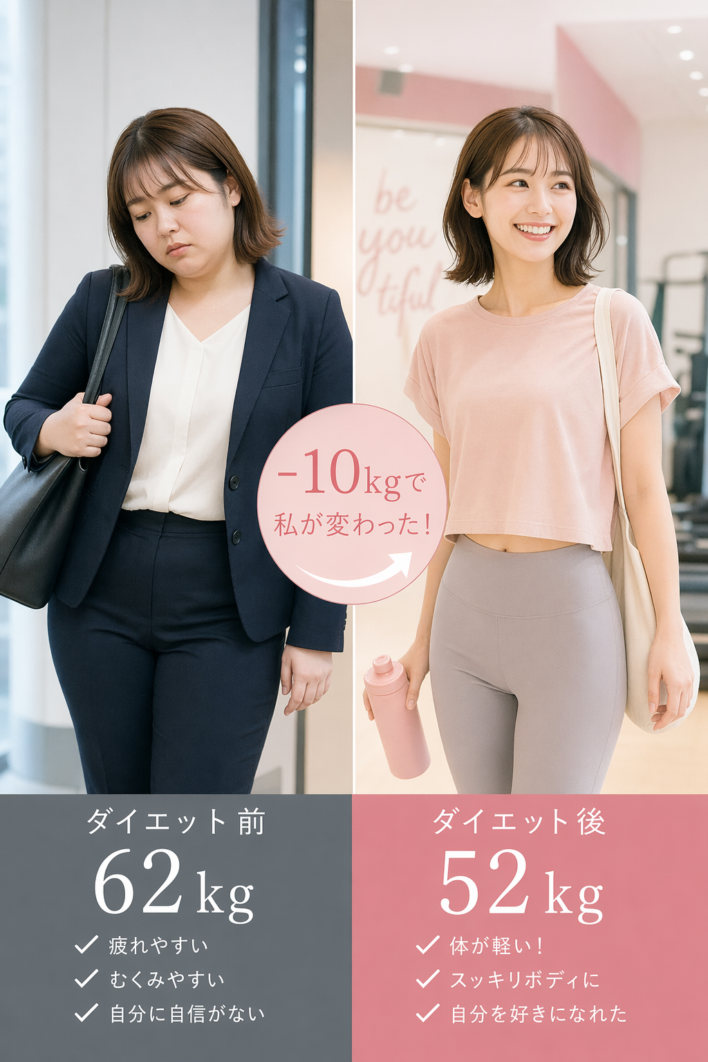 - 開始時の体重: 62kg(身長158cm/BMI 24.8)